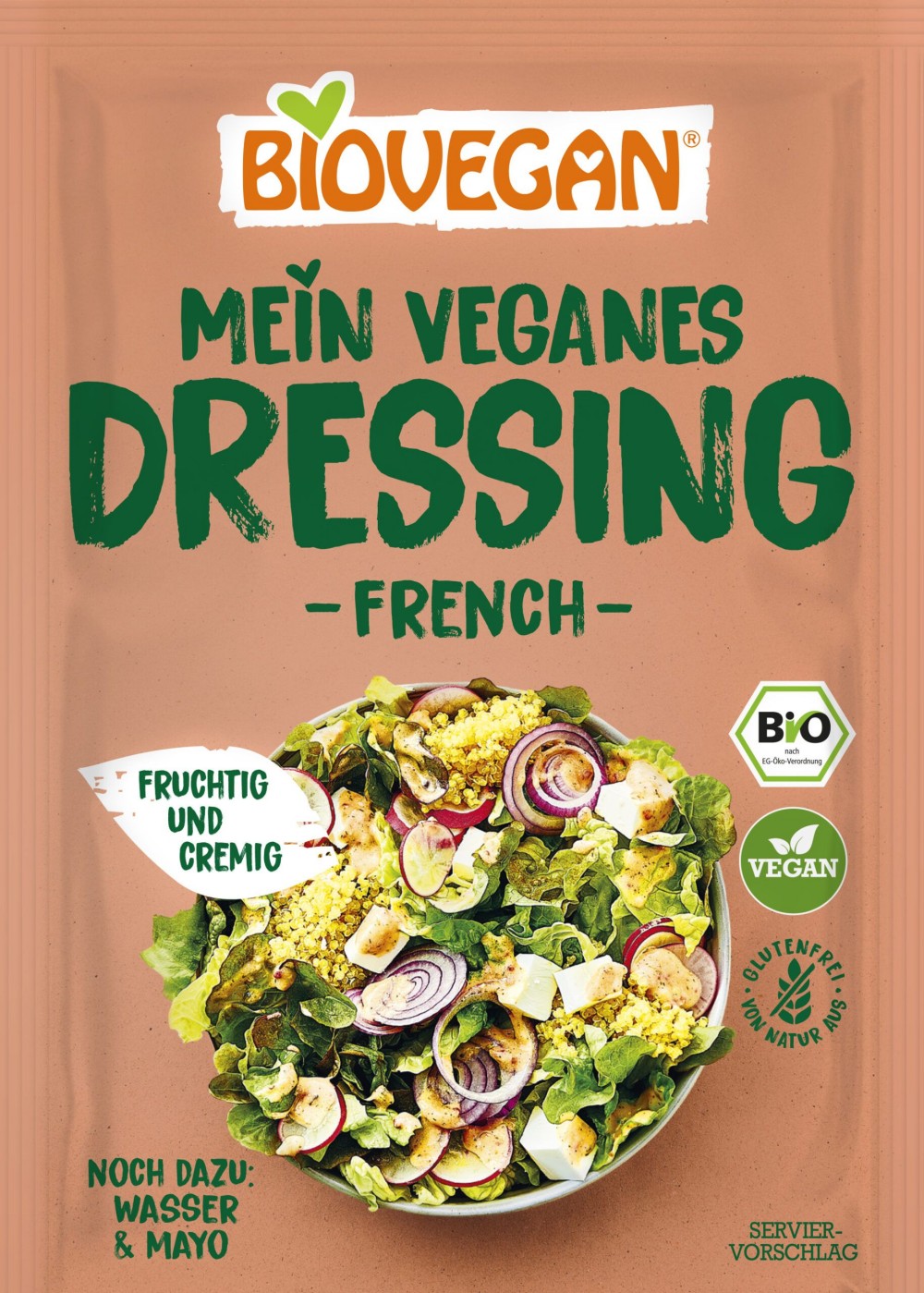 Descubra o meu molho vegan Francês biológico – a inovação finamente frutada e cremosa que irá elevar o seu prato a outro nível. Este molho, com ingredientes como tomate, manjericão e endro, é conhecido pelo seu sabor fresco e distintivamente frutado. Prepará-lo é simples: basta adicionar um pouco de água e molho tipo maionese vegana para desfrutar de um molho pronto num instante.