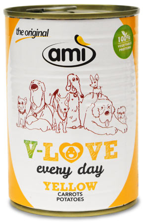 A ração vegetariana húmida amì é um alimento enlatado para cães adultos, para enriquecer a alimentação do seu cão diariamente.
